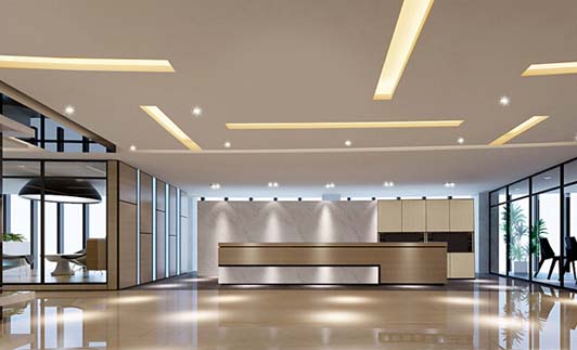 同時,上圖也展示前臺區辦公室裝修最好的一面給我們。加厚型的平面石膏板天花,它的室內格局來得更加豪邁大氣,迷宮地圖式的天花燈光布置瞬間把前臺區的裝修體現得很豪華大氣。