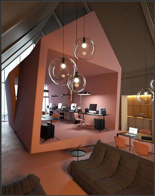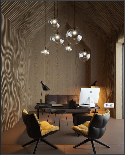 設(shè)計(jì)師把這里的吊燈用透明泡泡的玻璃罩來裝飾它的外表,此次辦公室裝修設(shè)計(jì)用了邊角料的來美化室內(nèi)的辦公環(huán)境,藝術(shù)魅力很強(qiáng)烈的辦公室裝修設(shè)計(jì)是有很強(qiáng)烈的感染力的作品,這是一個(gè)開放式的空間設(shè)計(jì)手法,增強(qiáng)了藝術(shù)的氣氛。